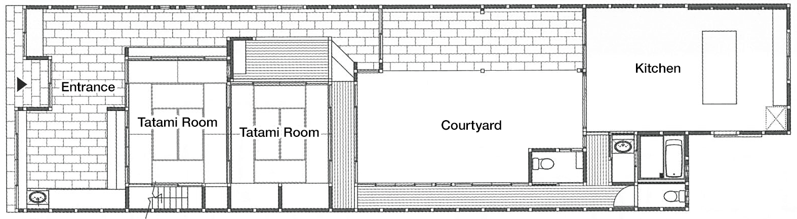 Stepping foot into the house, people are usually surprised at how deep the house goes. The front of the house facing the street is rather narrow with a depth many times greater than the front width. This is a common basic characteristic to machiya, Japanese traditional houses with attached shops.